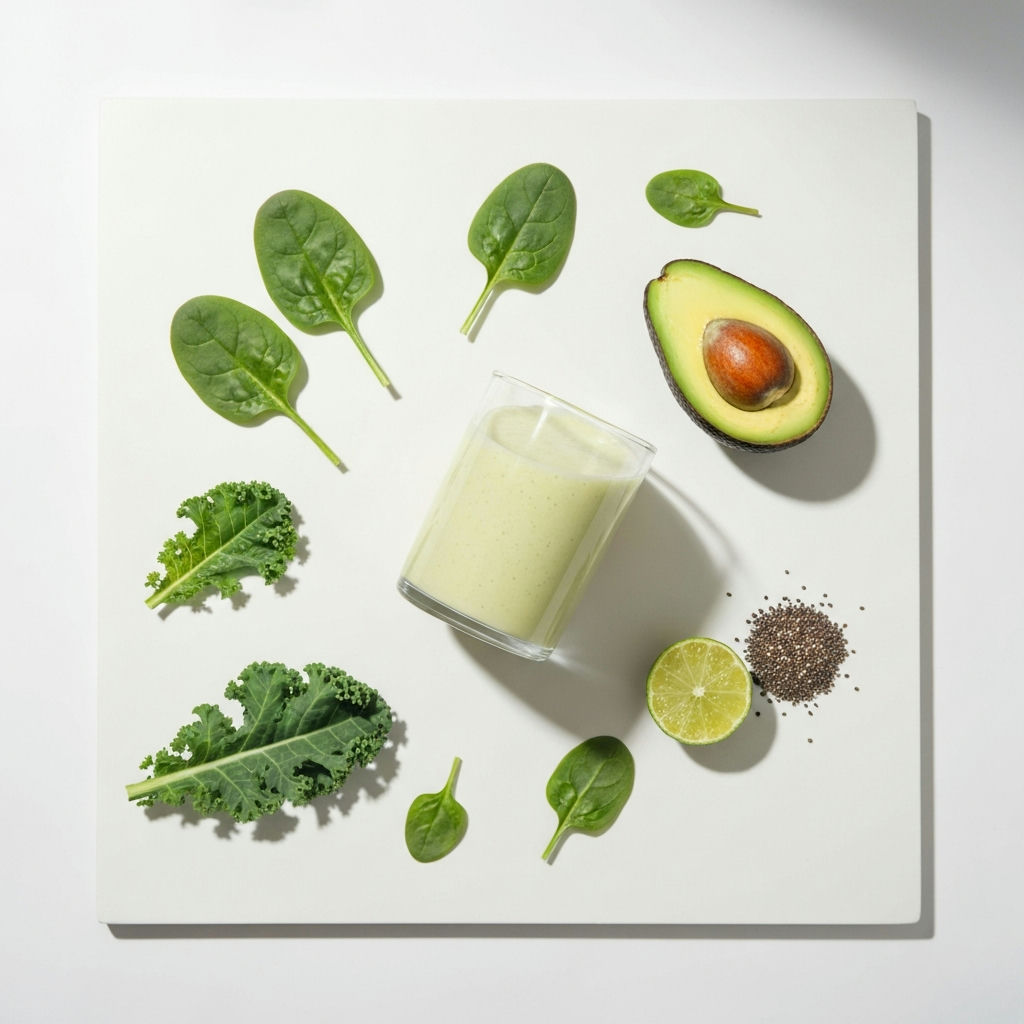 Grünes Blattgemüse wie Spinat, Grünkohl oder Feldsalat liefert viele Vitamine und Mineralstoffe, aber kaum Kalorien. Sie geben deinem Shake eine frische Note.
