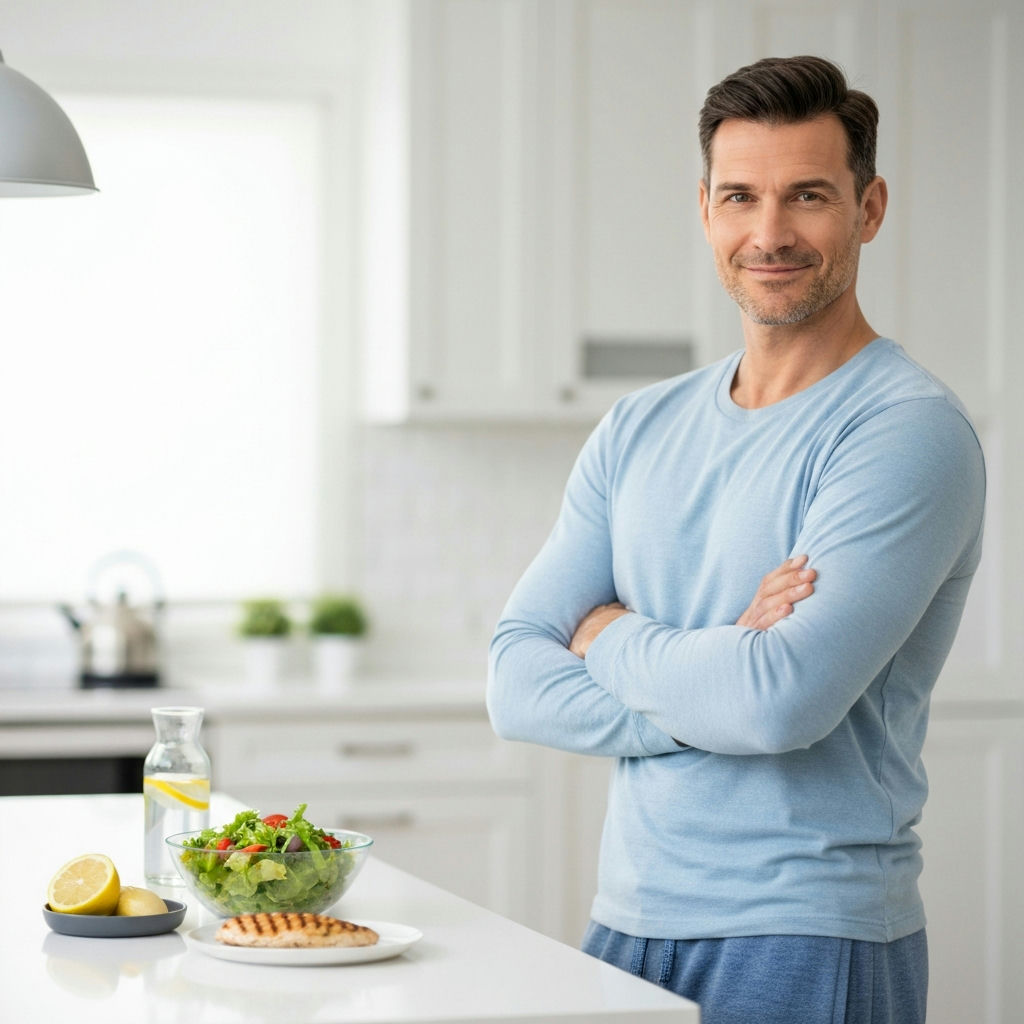 A contented man, mid-30s, in a comfortable, bright home setting, perhaps in a kitchen or living room, with a noticeably flatter stomach. He is casually dressed, smiling gently, perhaps holding a cup of herbal tea or a piece of fruit, embodying a sense of ease and well-being gained without intense exercise. The scene should convey a relaxed lifestyle focused on healthy eating and inner balance. Realistic photo style, soft natural lighting.