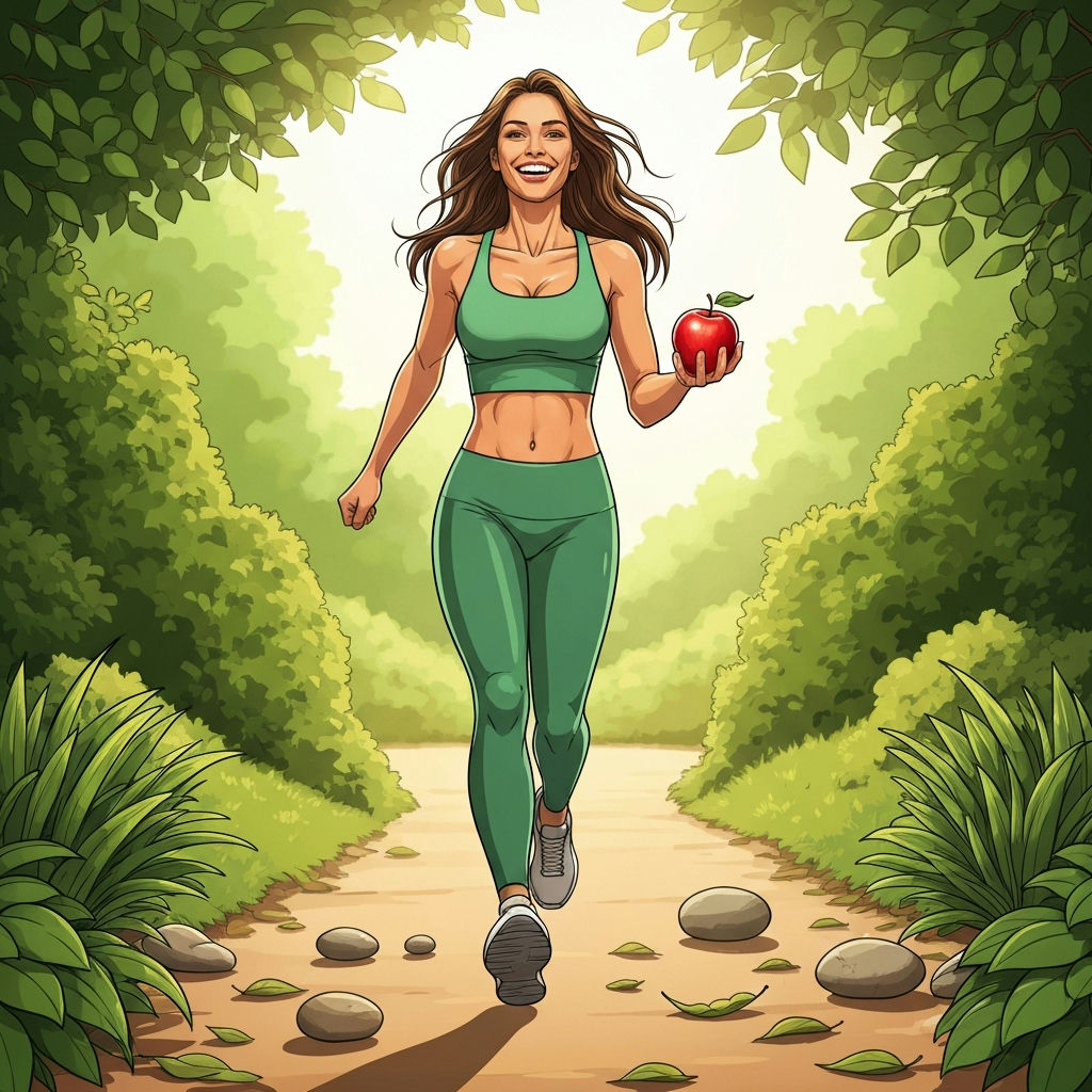 A bright, serene image showcasing a healthy, natural lifestyle for weight loss. In the foreground, a beautifully arranged assortment of fresh, colorful fruits (like berries, citrus, apples), vibrant vegetables (leafy greens, bell peppers), whole grains, and nuts. A clear glass of water is also present. In the soft-focus background, a person is taking a relaxed walk or doing gentle stretching in a sunlit natural environment, such as a park or a lush garden. The overall aesthetic is clean, fresh, and emphasizes natural well-being and vitality, completely free from any artificial products, pills, or processed foods. Realistic, soft lighting.