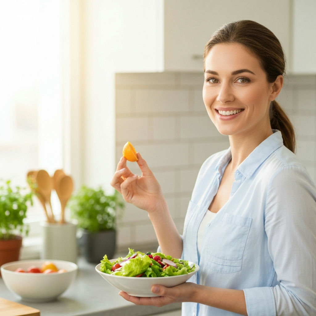 A person with a serene and happy expression, gently enjoying a diverse plate of colorful, healthy food in a bright, relaxed setting, possibly outdoors or by a window. The atmosphere is calm and inviting, emphasizing well-being, balance, and enjoyment rather than deprivation or struggle. Soft, natural light, realistic photo style. The scene evokes 'weight loss without frustration' and sustainable habits.