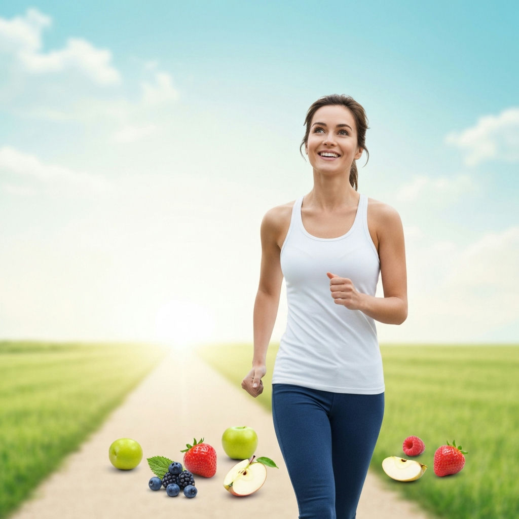 A happy, fit woman smiling as she enjoys a vibrant, abundant, and healthy meal composed of colorful vegetables, lean protein, and whole grains. The scene emphasizes satisfaction and enjoyment, not restriction or hunger, set in a bright, modern kitchen or dining area. The overall mood is positive and energetic, reflecting a sustainable lifestyle. Realistic, high-quality photograph.