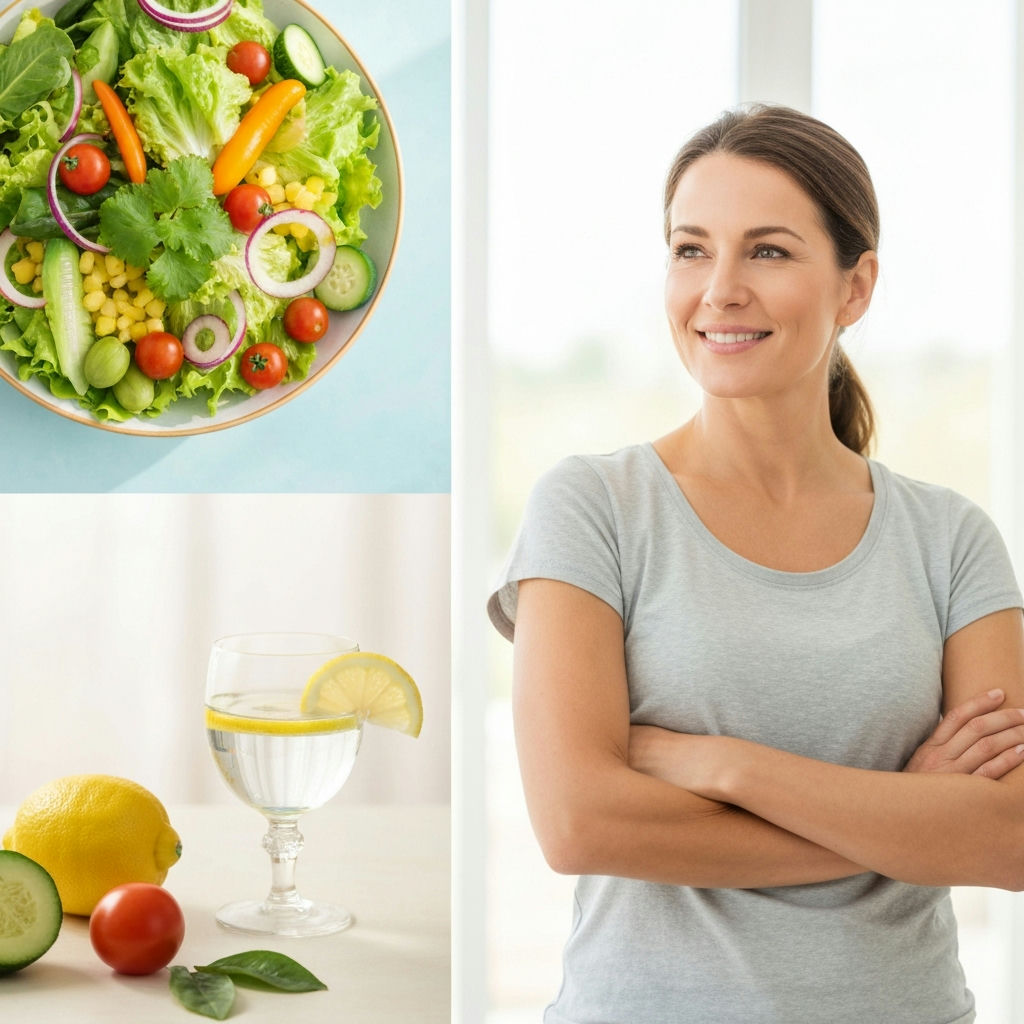 A serene and inviting image of a person looking healthy and content in a bright, modern kitchen or dining area. They are mindfully enjoying a beautifully presented, balanced meal (e.g., a vibrant salad with lean protein, whole grains). The scene emphasizes conscious eating and healthy nutrition as the path to weight loss, without any sports equipment or strenuous activity visible. The atmosphere is calm, sustainable, and promotes a feeling of everyday well-being. Realistic style, natural light.