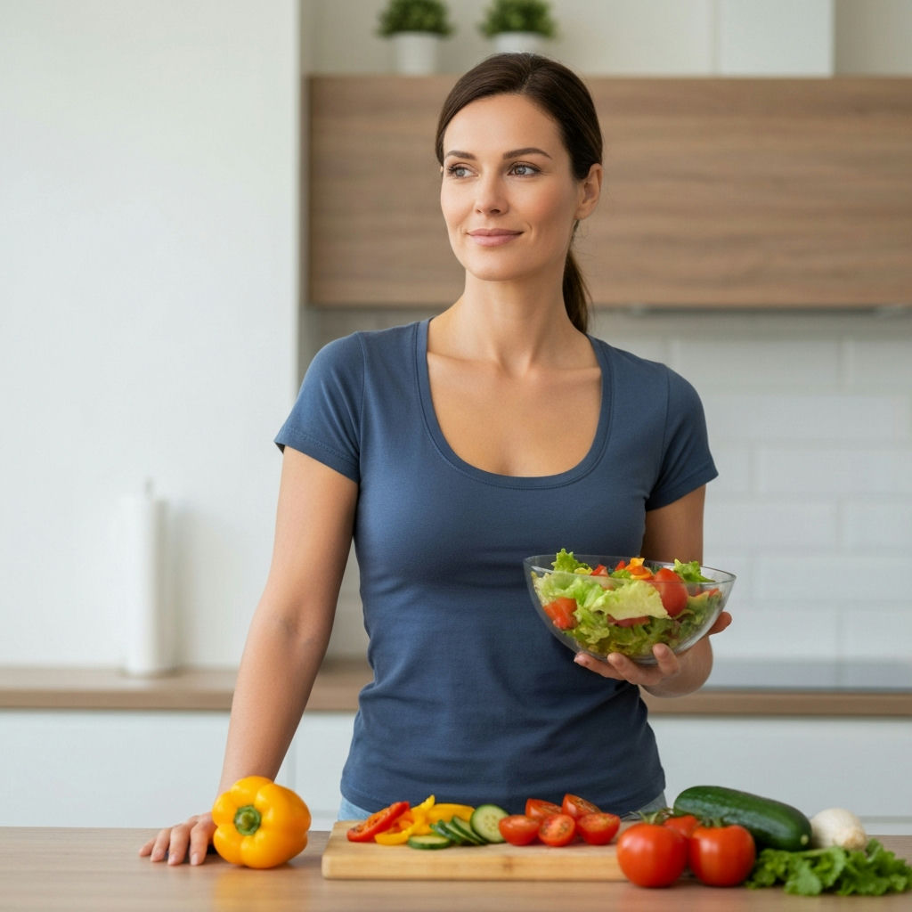 A smiling, energetic woman in her late 20s or early 30s, dressed in comfortable athletic wear, gently touching her flat stomach with a confident and happy expression. She is standing in a bright, clean, modern kitchen or home gym, conveying a sense of well-being, vitality, and successful healthy lifestyle change. The mood is positive and empowering. Realistic photo, natural light.