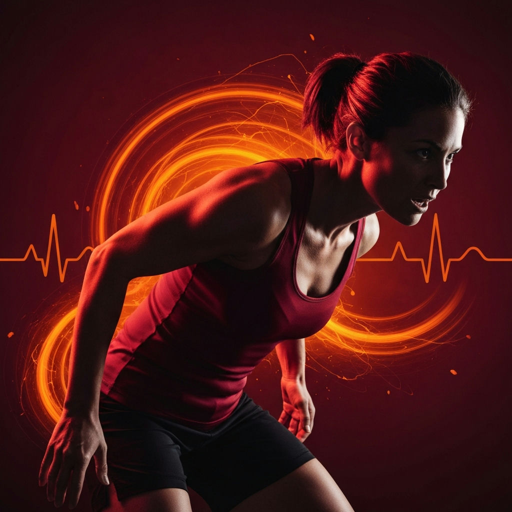 A dynamic, high-energy image of a determined person, visibly lean and muscular, engaged in an intense full-body workout such as sprinting or weightlifting. Sweat is visible, and the person exudes strength and focus. In the background, subtle, abstract visual effects suggest fat melting away or transforming into pure energy, perhaps with a slight glow or dissipation effect. The overall mood should be empowering and showcase the successful achievement of extreme fat burning. Realistic, cinematic lighting.