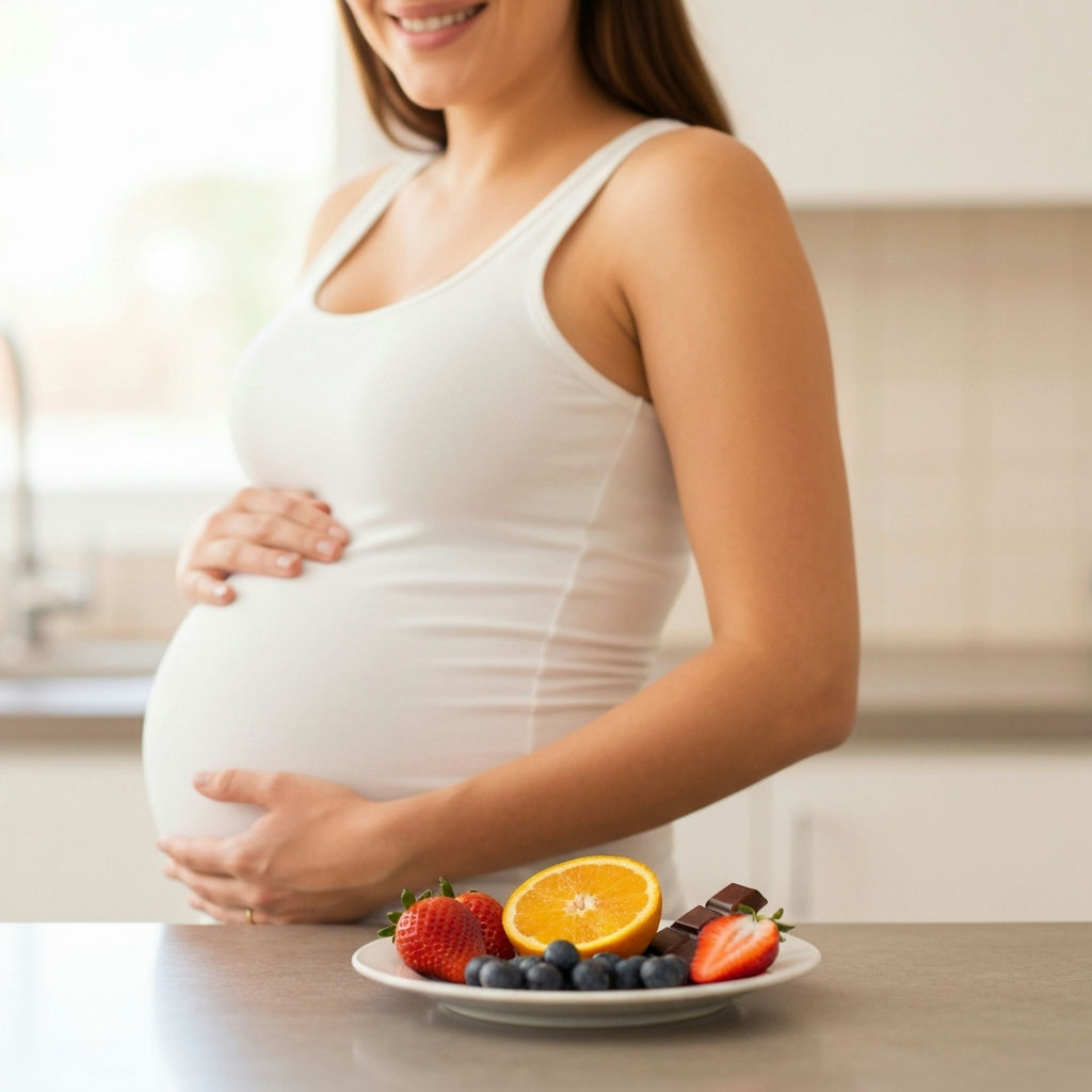 A radiant pregnant woman with a serene smile, happily enjoying a bowl of fresh, colorful fruit and a glass of water. In the soft-focus background, subtly visible are common craving foods like a chocolate bar and a bag of potato chips, representing temptations being gracefully overcome. The scene conveys a feeling of healthy choices, peace, and well-being during pregnancy, with warm, natural lighting. Realistic photo style.