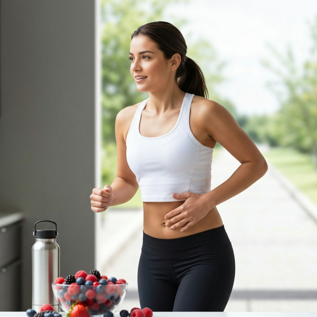 A vibrant, inspiring image of a person smiling confidently, holding a calendar page clearly highlighting '3 weeks' as a successful milestone for weight loss. They appear fit and healthy, with a subtle glow of achievement. In the background, out of focus, are elements suggesting a balanced lifestyle like fresh fruits, vegetables, or a water bottle. The overall mood is positive and motivating. Studio lighting, realistic style with a touch of warmth.