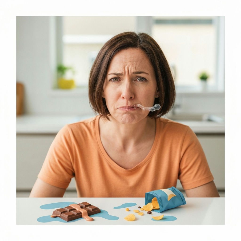 A person with a conflicted, frustrated expression, struggling to resist a strong craving for a spread of tempting, unhealthy snacks like chocolate, potato chips, and candy. Their hand is hovering over the food or pulling away, illustrating an internal battle. The setting is a cozy home kitchen. Realistic style, vibrant colors.