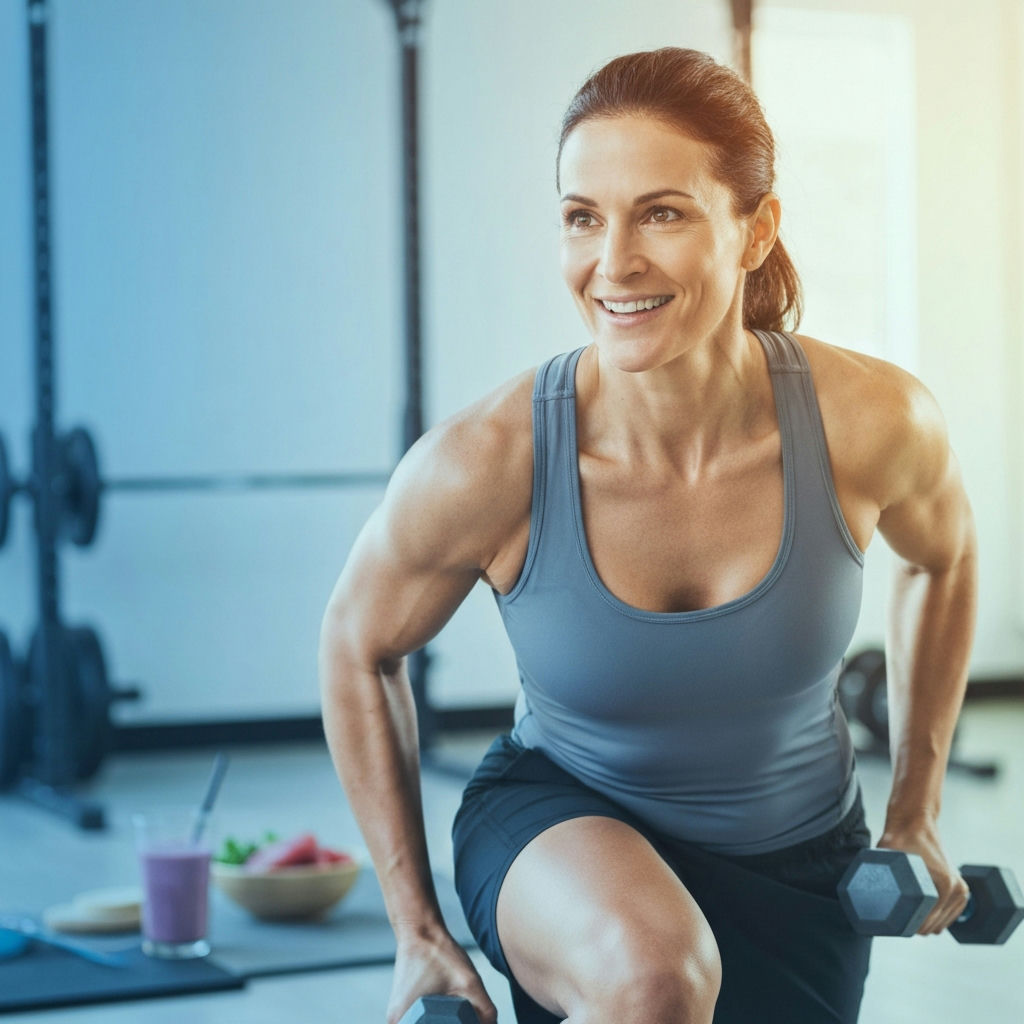 A fit person, appearing strong and healthy, with a visibly flat stomach and defined muscles (e.g., biceps, abs). The image should symbolize the successful achievement of both losing belly fat and building muscle simultaneously, in a bright, modern fitness studio setting. Realistic photograph with motivational lighting.