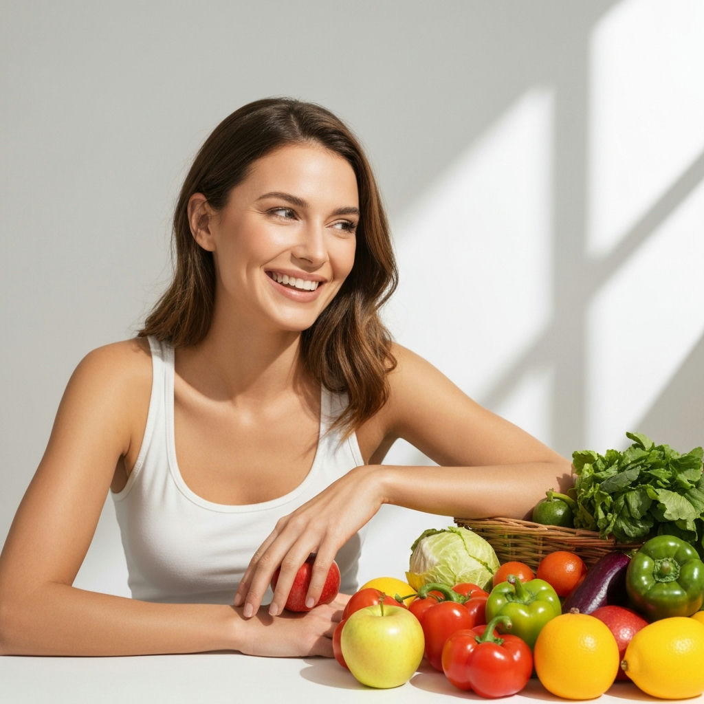 A happy and serene person, smiling gently, enjoying a vibrant, delicious, and healthy meal (e.g., a colorful bowl with fresh vegetables, fruit, and lean protein) in a relaxed, sunlit kitchen or patio. The image should convey pleasure, abundance, and a feeling of natural well-being, emphasizing a joyful and effortless approach to healthy eating without any signs of deprivation or strict dieting. Photorealistic style.