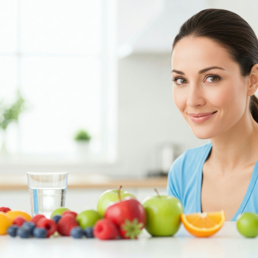 A vibrant, healthy-looking person, smiling confidently, holding a bowl of colorful fresh fruits and vegetables. In the background, blurred and receding into the distance, are various sugary processed foods like pastries and sodas, symbolizing being left behind. The setting is bright, clean, and optimistic, conveying a sense of energy and well-being from a sugar-free lifestyle. Digital art, clean lines, blog article style.