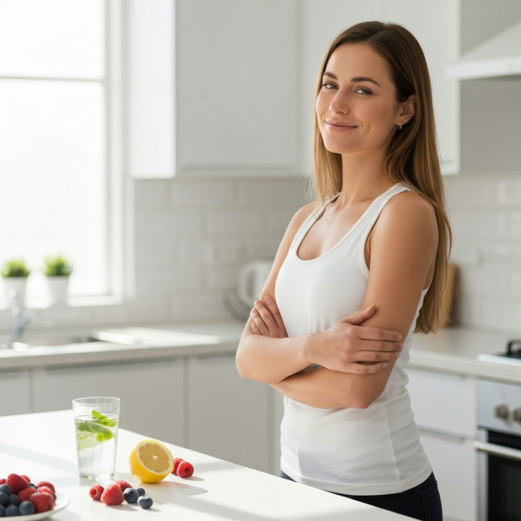A relaxed person with a noticeably flat stomach, dressed casually and comfortably, holding a glass of water or a healthy snack like a fruit, in a bright, clean home environment. There are no sports or exercise elements visible. The overall mood is calm, effortless wellness and healthy living.