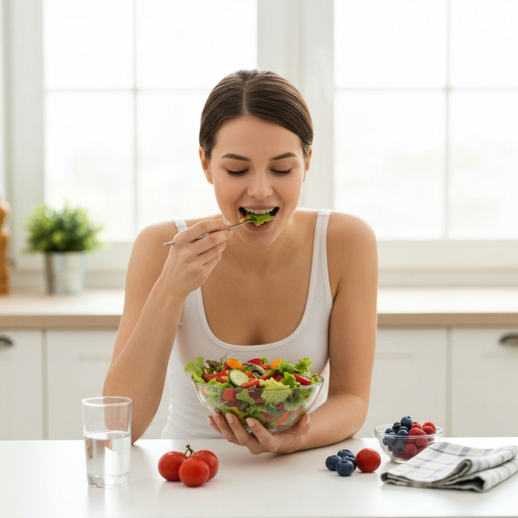 Besonders hilfreich sind unverarbeitete Lebensmittel wie Gemüse, Obst, Vollkornprodukte und mageres Eiweiß. Sie machen satt, liefern wichtige Vitamine und enthalten wenig Kalorien. Vermeide Fertiggerichte und zuckerhaltige Snacks.