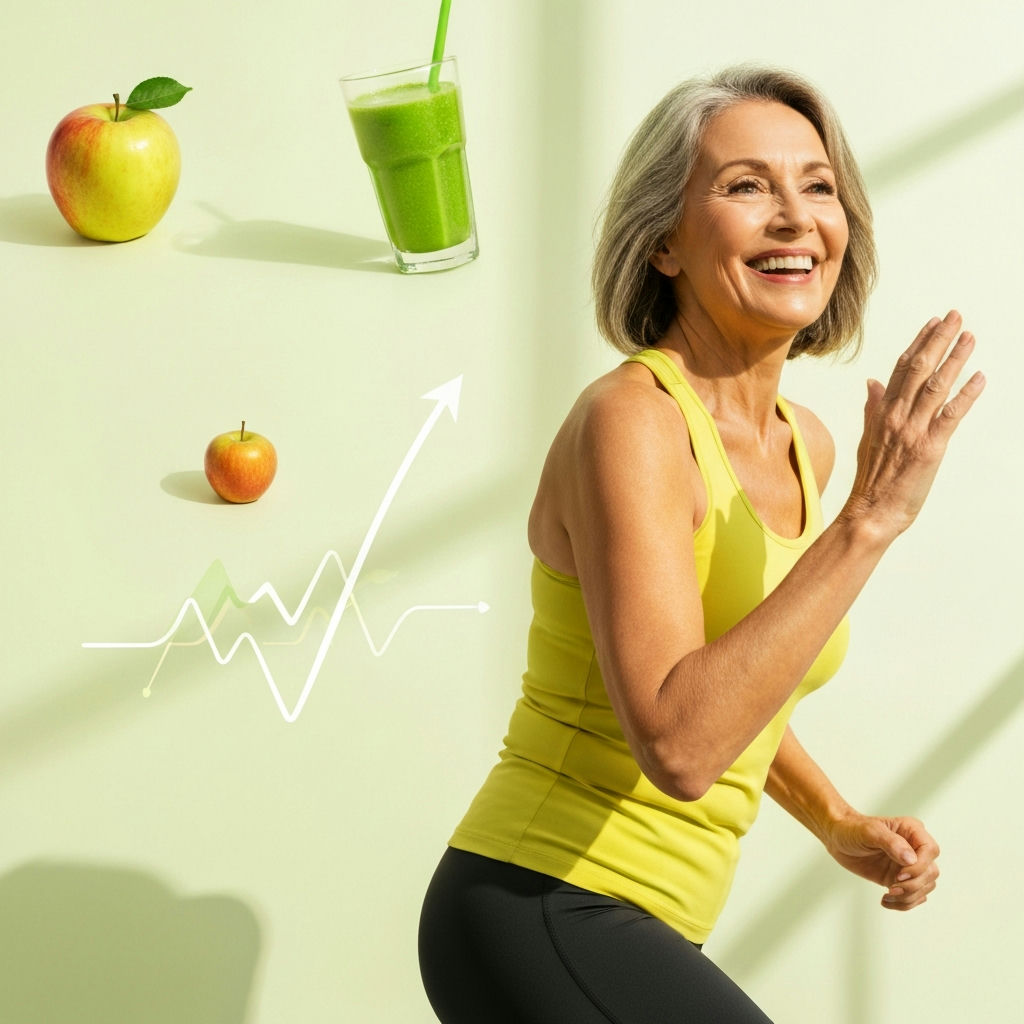 A vibrant, energetic woman in her late 50s or early 60s, smiling brightly while briskly walking or doing light exercise outdoors in a sunny park. A subtle, warm glow emanates from her, symbolizing renewed energy and a boosted metabolism. The image should convey vitality, health, and joy. Realistic style, bright colors.